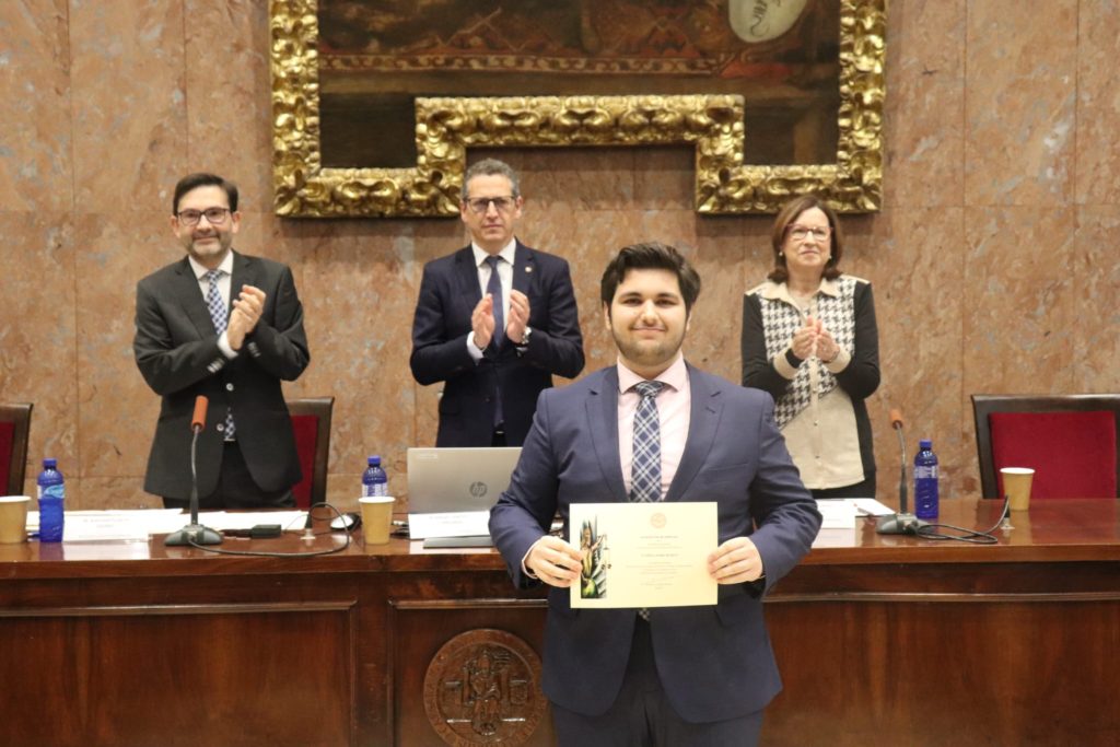 Además, en el acto se homenajeó a los 3 estudiantes con los mejores expedientes en las diferentes titulaciones, siendo el mejor expediente del Grado de Derecho del curso 22-23 para Diego Lozano Castro, ex alumno del IES Reyes Católicos.
