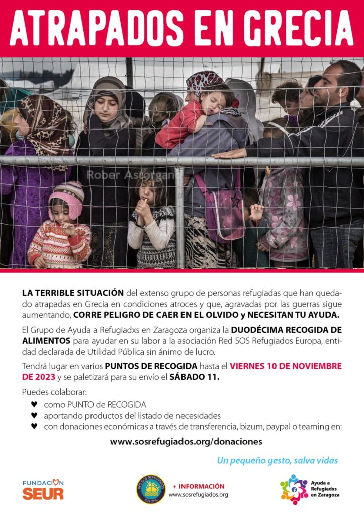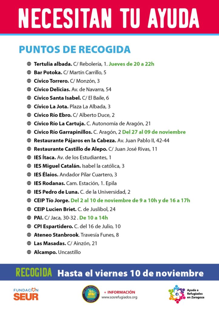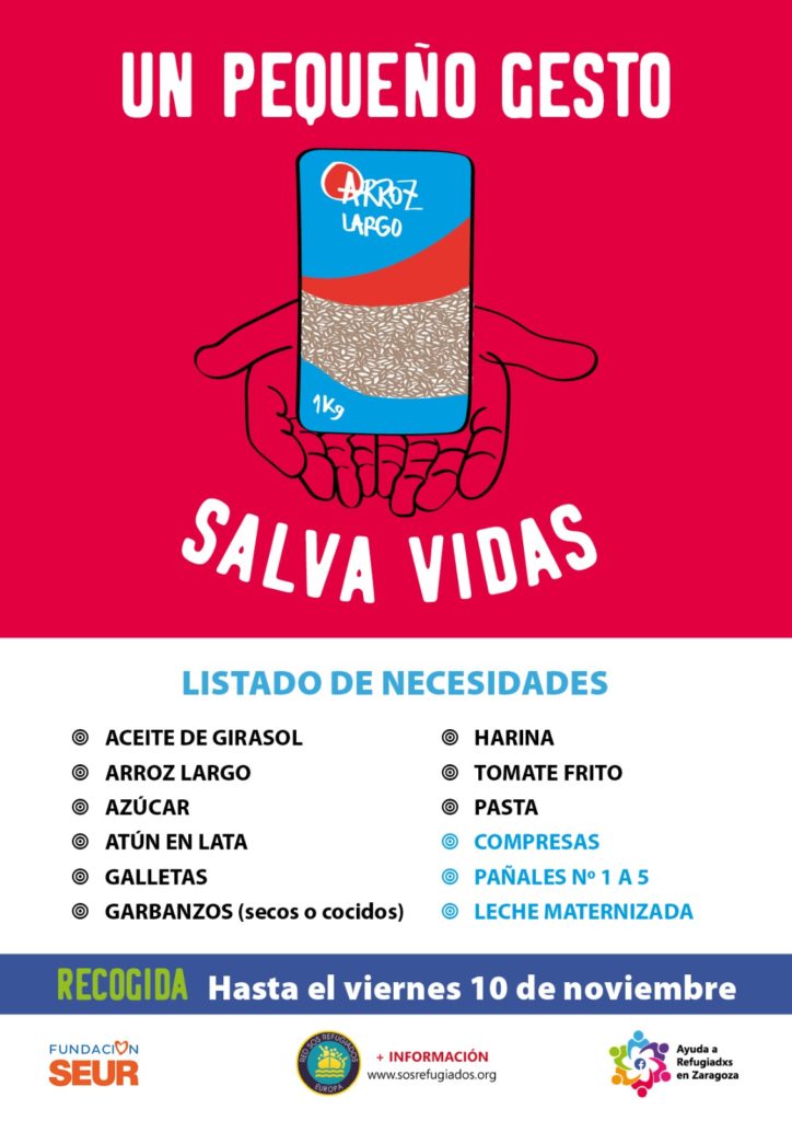 Los días 6, 7 y 8 de noviembre se va a llevar a cabo una recogida de alimentos y productos de higiene personalen el centro para enviar a los campamentos de refugiados de Grecia a petición de la Asociación de Refugiados de Zaragoza. Los productos podrán depositarse en las cajas situadas en la entrada del IES.