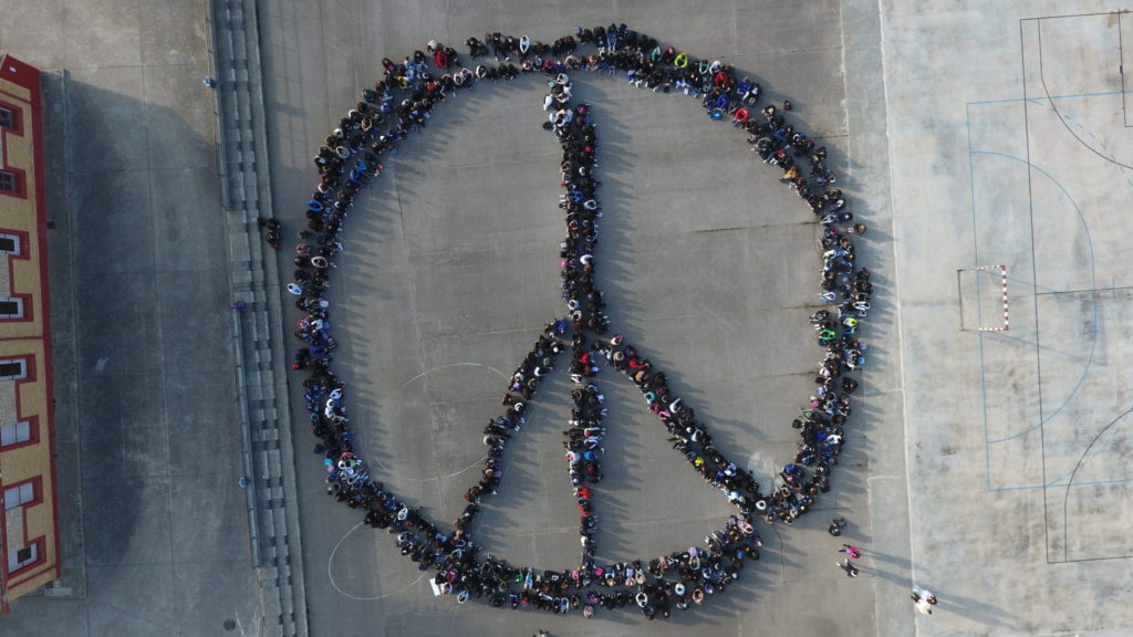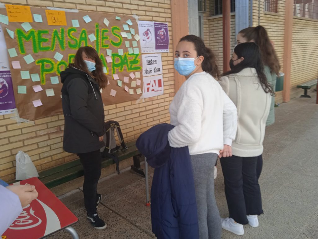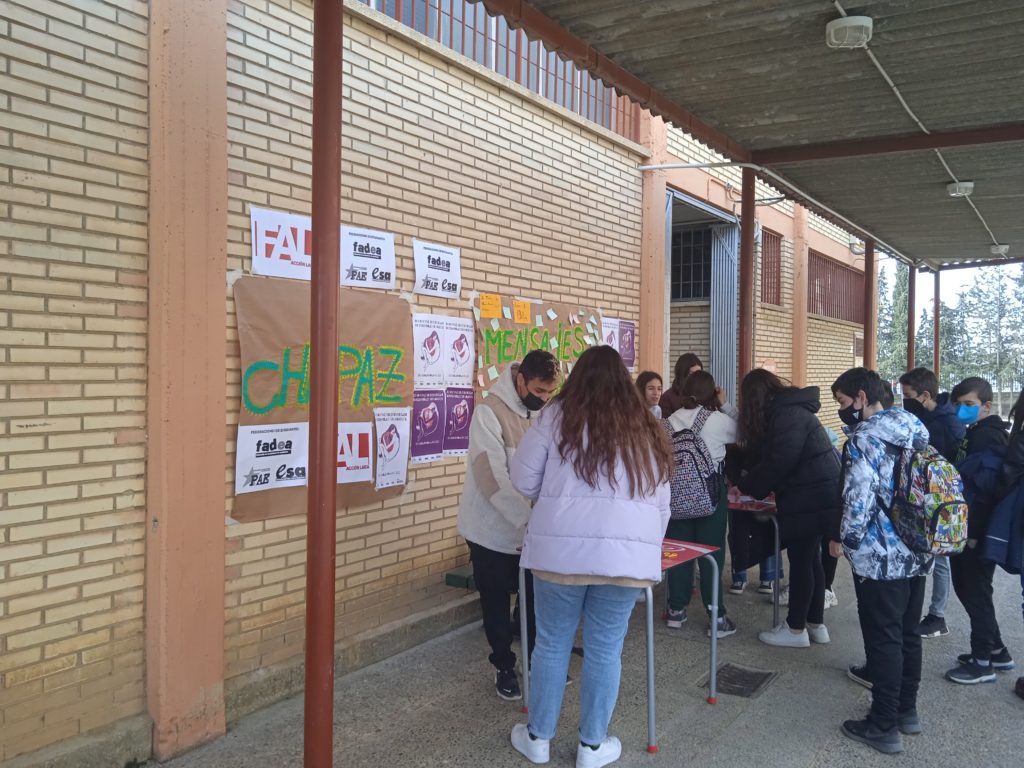 04/01/2022 A lo largo de estas dos últimas semanas hemos celebrado el Día de la Paz y la No Violencia a través de varias actividades. Estas actividades han sido organizadas, desarrolladas y gestionadas por FADEA (Federación de Asociaciones de Estudiantes de Aragón) y han consistido en RECREOS SOLIDARIOS en los que se trabajó la situación de los Derechos Humanos en distintos lugares del mundo, haciendo especial hincapié en la situación de los niños en entornos en conflicto. Además, todo el centro participó en la creación de un símbolo de la paz humano y en la creación de mensajes para la paz que se compartieron en un mural colaborativo colgado en el recreo. El alumnado se pudo llevar una chapa de recuerdo de este día en un taller de chaPAZ realizado en el recreo.