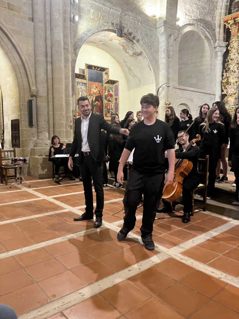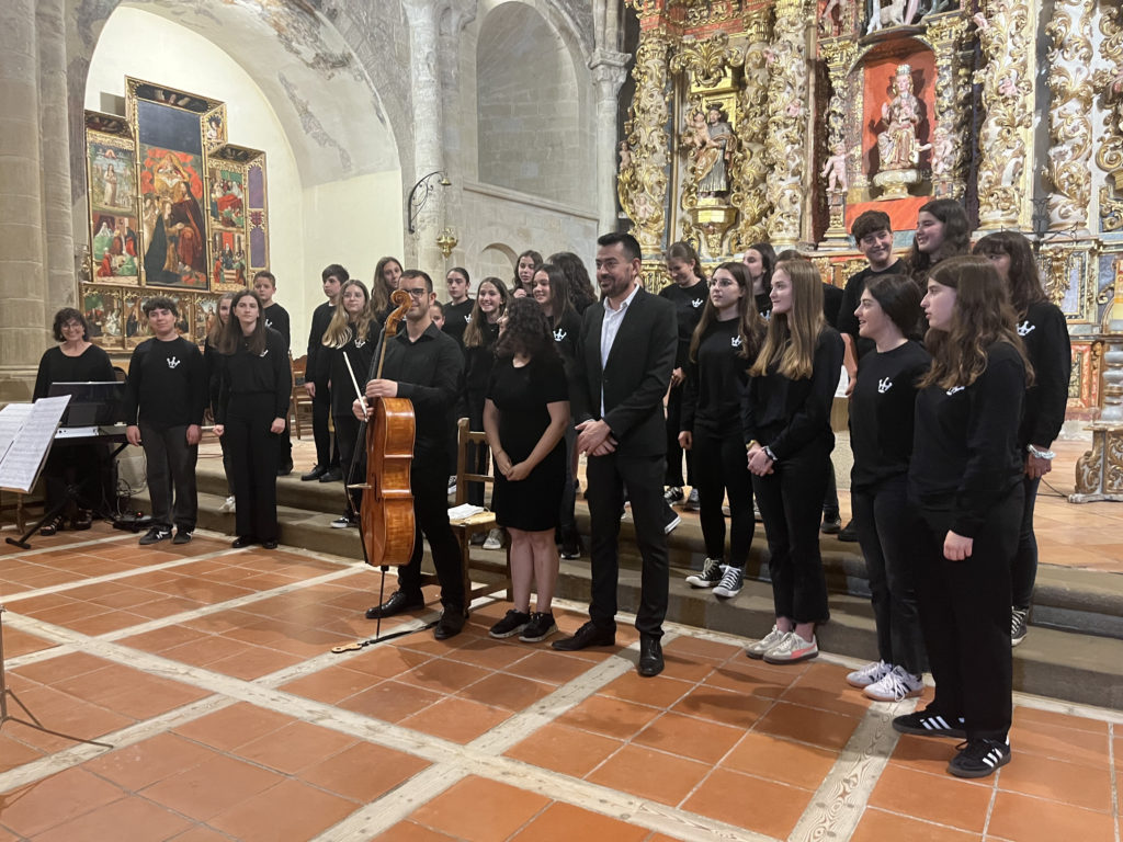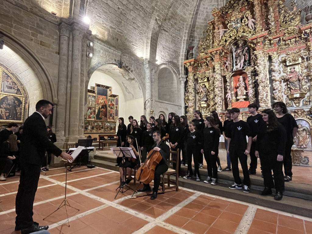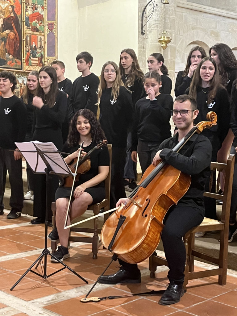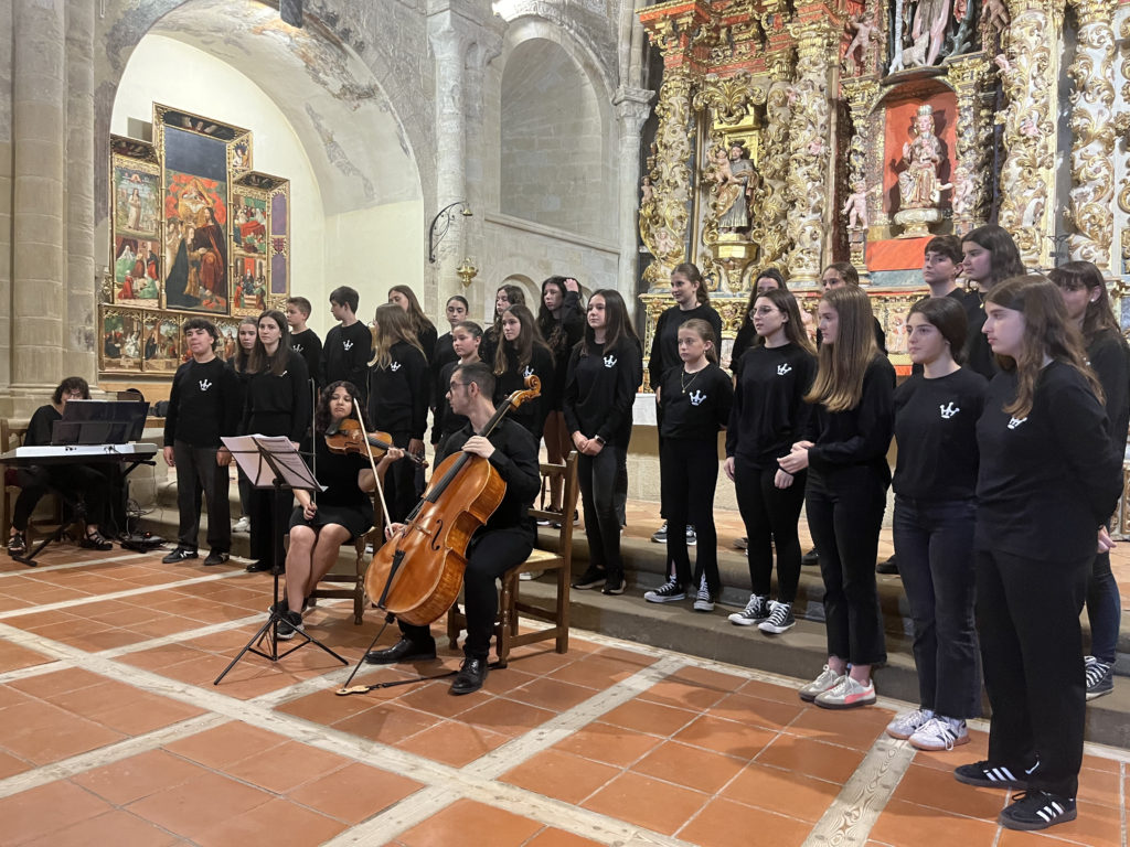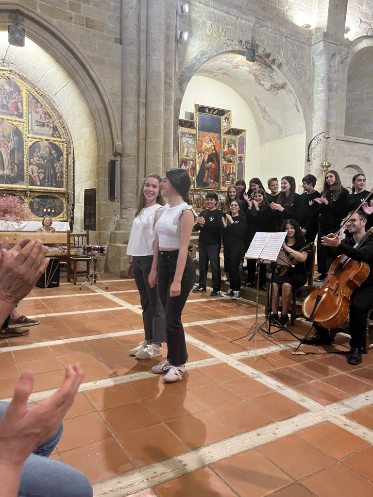 08/06/2025 La Iglesia de Santa María de la Corona ha acogido el último recital con el que el Coro del IES Reyes Católicos cierra el curso 24-25. Al repertorio de canto vocal interpretado por el alumnado integrante del coro y acompañado al piano por Pilar Aurensanz, se le ha sumado una actuación muy especial, la de los profesores del Dpto. de Música –Daniel Giménez, Pilar Gastou y Juan Manuel Fernández al clarinete, violín y chelo, respectivamente.