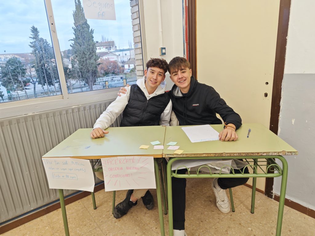 Una de las partes más motivadoras del proyecto fue la creación de un stand de seguros por parte de cada grupo. El alumnado diseñó su propio espacio expositivo, con carteles, logotipos, folletos y materiales publicitarios, simulando una feria de seguros real. Durante la actividad, presentaron y defendieron sus productos ante otros compañeros y miembros de clase.