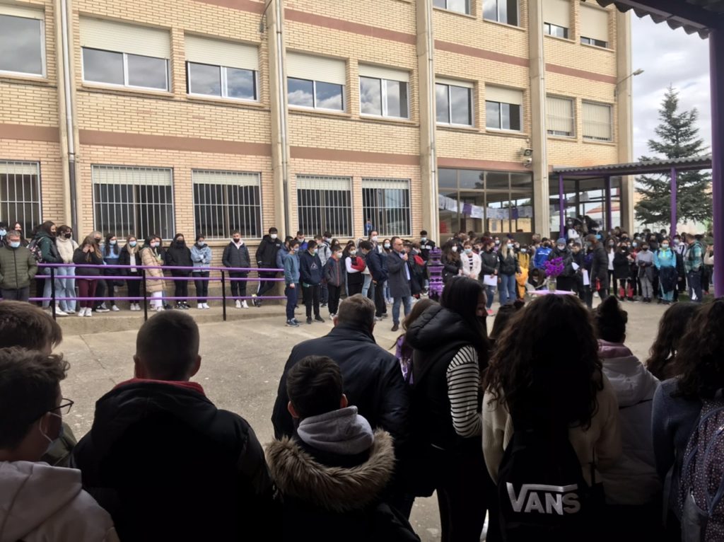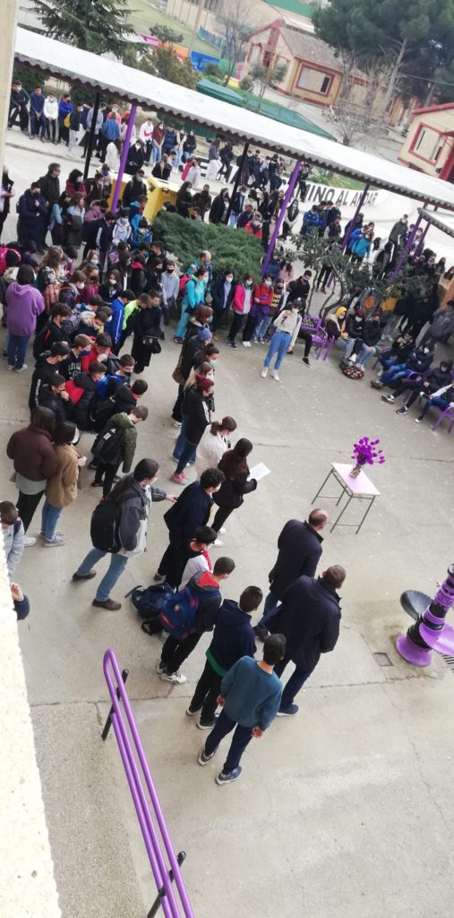 El alumnado de FPB y del CFGM de Producción Agropecuaria, con la ayuda de sus profesoras, han llevado a cabo el acondicionamiento de la zona, pintando con los colores morado y negro diferentes elementos de la plaza, en la que también se han instalado bancos para favorecer el diálogo y la reflexión especialmente en estos temas, a modo de ágora de la antigua Grecia.
